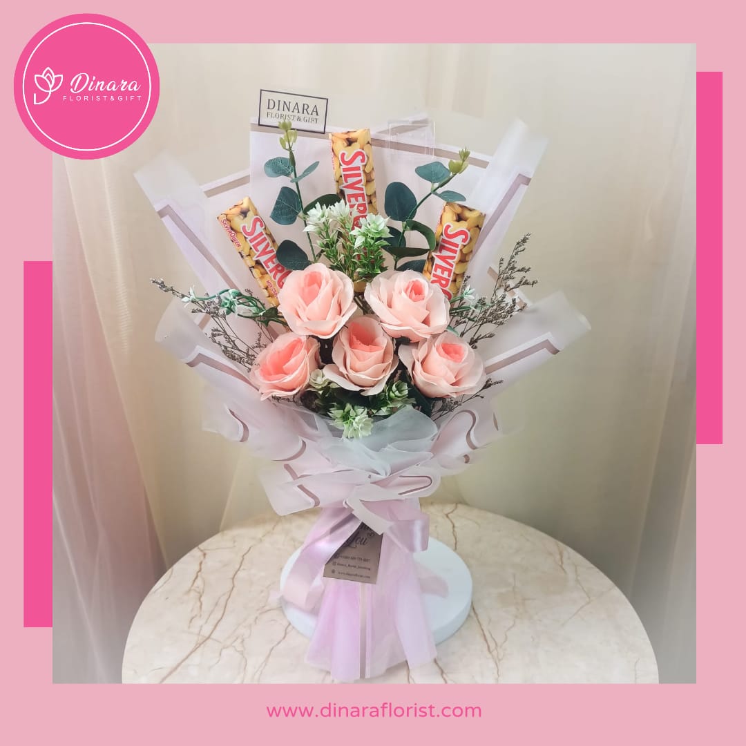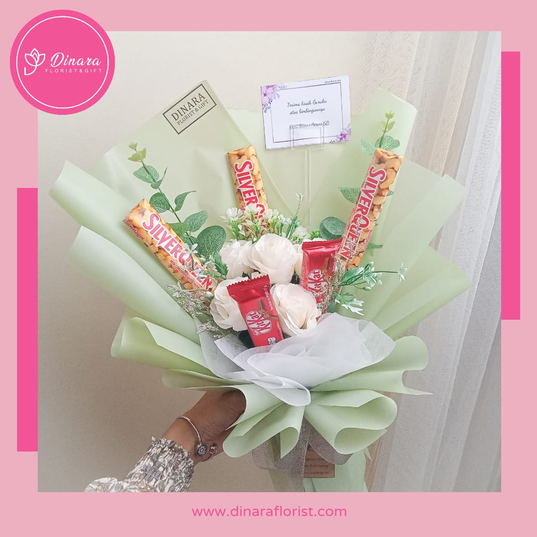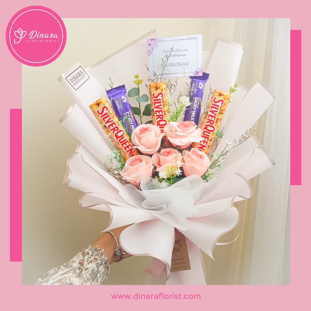 Buket snack coklat dengan tambahan bunga artificial atau bisa dipesan sesuai keinginan